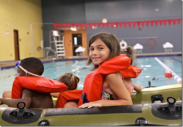 On the last day they practiced boat safety. Here is Grace going off into the pool. Little did she know they would flip the boat to teach the kids how call out for help and not to panic in a water emergency!